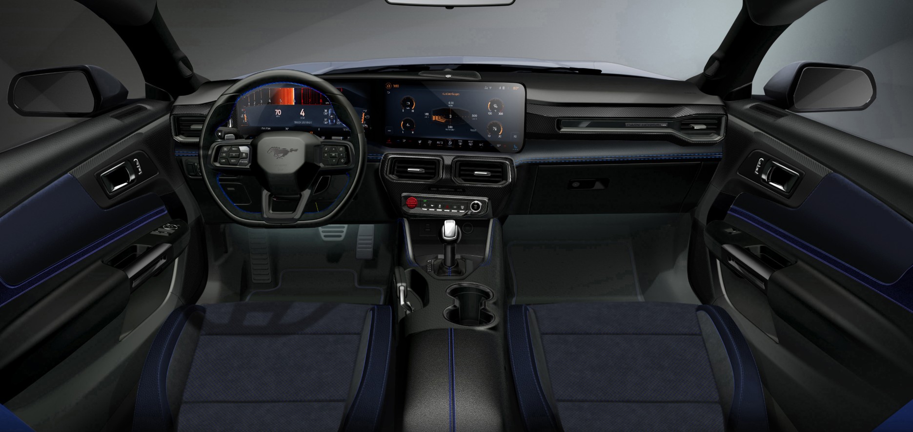 Inside, the 2027 Mustang Dark Horse takes a leap toward modern luxury and driver-focused ergonomics. The cockpit is designed with motorsport influence, featuring a flat-bottom steering wheel wrapped in Alcantara, blue stitching, and a dedicated drive mode selector. A 13.2-inch digital instrument cluster merges seamlessly with a 12.4-inch central touchscreen, running Ford’s latest SYNC 5 interface. Ambient lighting adjusts with driving mode selections, while the dash incorporates carbon fiber inserts and anodized metallic accents. The optional Recaro sport seats, finished in deep blue Alcantara, provide exceptional lateral support during spirited driving. Comfort and connectivity meet performance, creating a cabin that feels purpose-built yet inviting.